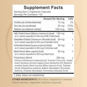 - Each serving contains Choline 12mg, Zinc Picolinate 30mg, Selenium 100mcg, Milk Thistle 500mg, Dandelion Root 200mg, Artichoke 200mg, Beet Root 200mg, as well as a 200mg blend of Black Currant Oil, Turmeric, Burdock, Berberine HCl, and more.