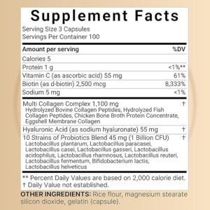 - 300 capsules per bottle. Up to a 100-day supply. 3 capsules per serving deliver collagen, hyaluronic acid, biotin, vitamin C, and probiotics.