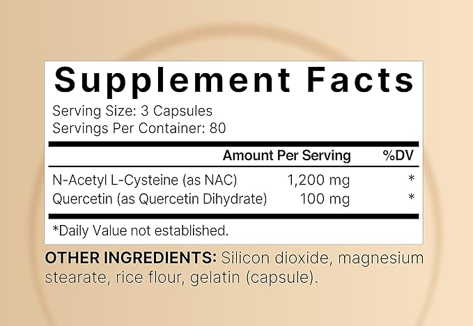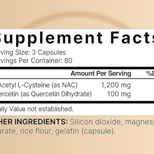 • 240 capsules per bottle, 3 capsule serving size, delivers 1,200mg pure N-Acetyl L-Cysteine (NAC) with 100mg quercetin dihydrate per dose, lasts up to an 80-day supply.