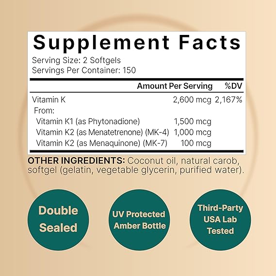 - 300 coconut oil softgels, 2 softgel serving size, delivers 1,500mcg K1 as phytonadione with 1,000mcg K2 as menatetrenone (MK4) and 100mcg menaquinone (MK7) per dose, lasts up to a 150-day supply.