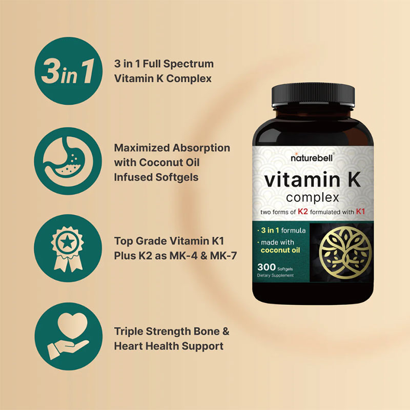 - Complete vitamin K complex softgels, 3 in 1 full spectrum formula with K1 and K2 as MK4 and MK7, infused with coconut oil to help absorb vitamin K’s fat-soluble nutrients.